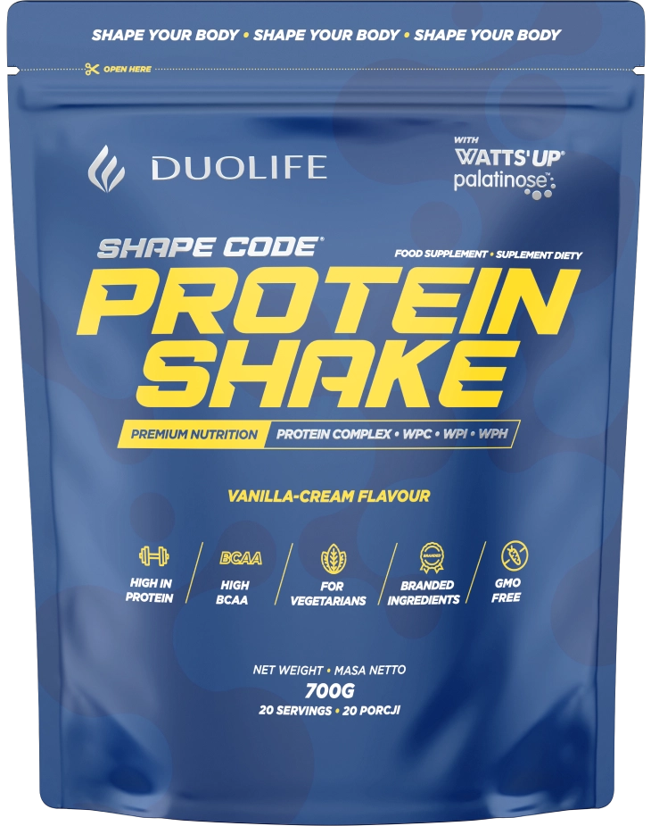 Sposób użycia: Dodaj dwie płaskie miarki proszku (łącznie 35 g) do 200 ml chłodnej wody lub ulubionego napoju roślinnego, mocno wstrząśnij, aby zawartość nie osiadła na dnie. Tak przygotowany koktajl o smaku waniliowo-śmietankowym spożywaj 1–2 razy dziennie. Zaleca się stosowanie bezpośrednio po zakończeniu treningu. Nie należy przekraczać zalecanego dziennego spożycia. Produkt nie może być stosowany jako substytut (zamiennik) zróżnicowanej diety. Stosuj ten koktajl jako część zbilansowanej i zróżnicowanej diety w połączeniu z aktywnym trybem życia. DUOLIFE Protein Shake korzystnie jest łączyć z: |