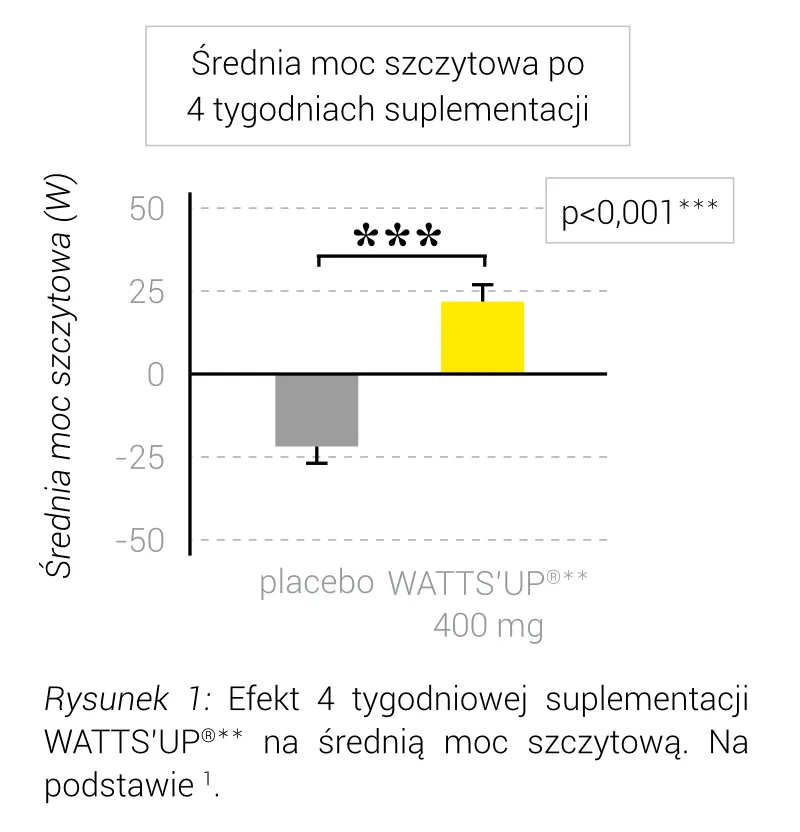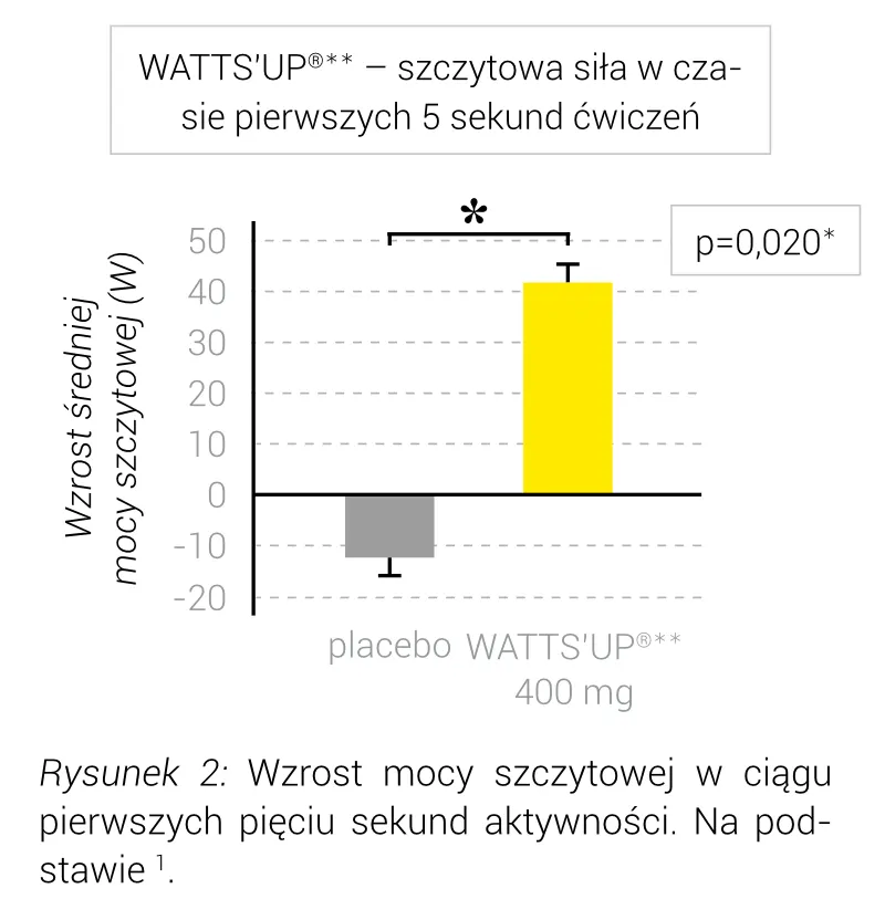 Co więcej wykazano, że szczytowa siła podczas pierwszych 5 sekund ćwiczeń znacznie wzrosła po 4 tygodniach suplementacji 400 mg WATTS’UP®** w porównaniu z placebo (p*=0,020), co odpowiada wzrostowi o 7,5% (Rysunek 3).