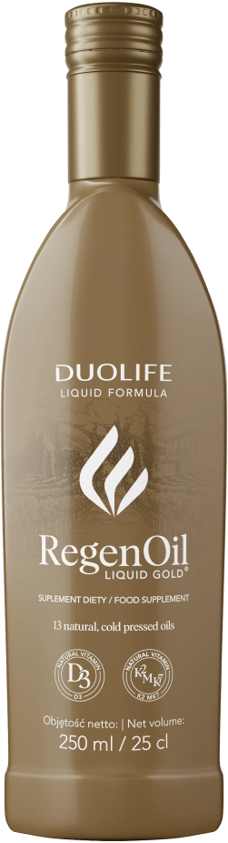 Dodatkowo produkt DUOLIFE RegenOil Liquid Gold® to źródło witaminy K2 MK7 pozyskanej z ekstraktu z natto, witaminy D3 pozyskanej z porostów oraz witaminy E pozyskanej z oleju słonecznikowego.