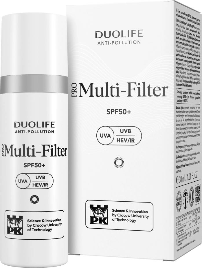 Kompozycja 6 zaawansowanych filtrów naturalnych i organicznych Krem Anti-Pollution Pro Multi-Filter SPF50+ 30 ml wykorzystuje kompozycję 6 zaawansowanych filtrów, które zapewniają kompleksową, efektywną i bezpieczną ochronę przed szkodliwym promieniowaniem UVA, UVB, IR oraz światłem niebieskim (HEV). Dzięki tej innowacyjnej formule skóra jest chroniona przed aż 4 rodzajami promieniowania, a także zanieczyszczeniami środowiskowymi, a więc czynnikami generującymi powstawanie toksycznych wolnych rodników tlenowych w komórkach. Generowany czynnikami środowiskowymi nadmiar wolnych rodników tlenowych oraz stres oksydacyjny odpowiadają za przedwczesne starzenie się skóry, jak również problemy skórne a także choroby skóry. Anti-Pollution Pro Multi-Filter SPF50+ 30 ml stanowi zaawansowaną formułę, która łączy naturalne filtry chroniące przed promieniowaniem (IR) i promieniowaniem niebieskim (HEV) oraz organiczne filtry chroniące przed promieniowaniem ultrafioletowym (UVA/UVB). Nowoczesne filtry organiczne UVA/UVB w produktach DUOLIFE zostały starannie dobrane, by zapewnić bezpieczeństwo oraz wysoką skuteczność i komfort codziennego stosowania. Zastosowane filtry oferują efektywną i precyzyjną ochronę przed promieniowaniem UVA i UVB. Jednocześnie są lekkie, przezroczyste i niewyczuwalne na skórze, co czyni je idealnymi pod makijaż, nawet dla cery tłustej, mieszanej czy trądzikowej. Są również łatwe w aplikacji i bardzo komfortowe w użytkowaniu, nie pozostawiając uciążliwych widocznych białych śladów na skórze. Nowoczesne formuły organiczne zapewniają wysoką odporność na pot, wodę i ścieranie, co sprawia, że filtry te są niezastąpione podczas aktywności fizycznej czy kąpieli słonecznych. Kompleksowe połączenie nowoczesnych filtrów organicznych UVA/UVB z naturalnymi filtrami IR i HEV zapewnia skuteczną i bezpieczną ochronę, komfort noszenia i trwałość działania, stanowiąc zaawansowane rozwiązanie do codziennej ochrony skóry. |