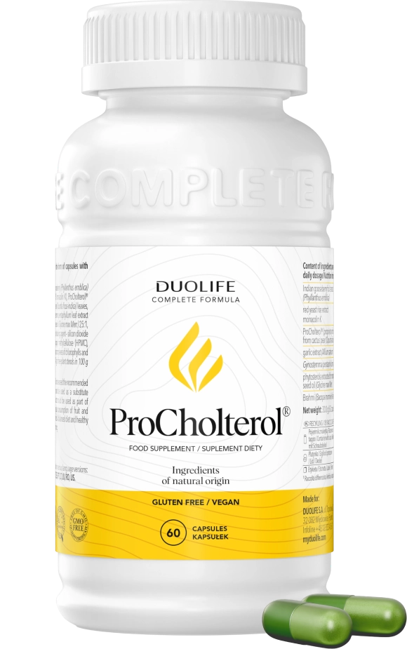 Suplement diety ProCholterol® to połączenie zastrzeżonej formuły ProCholterol® pozyskanej z liści opuncji figowej oraz ekstraktu z czerwonego ryżu fermentowanego na drożdżach, ekstraktu z owoców amli, fitosteroli roślinnych pozyskanych z ekstraktu oleju z pestek soi warzywnej oraz wielu innych cennych składników roślinnych.