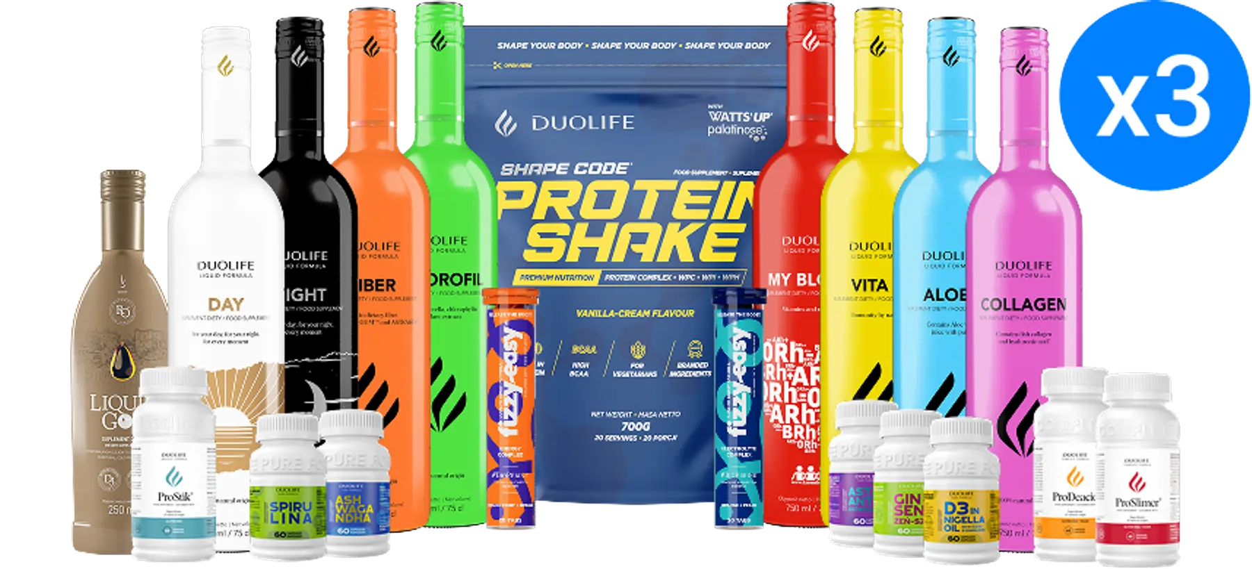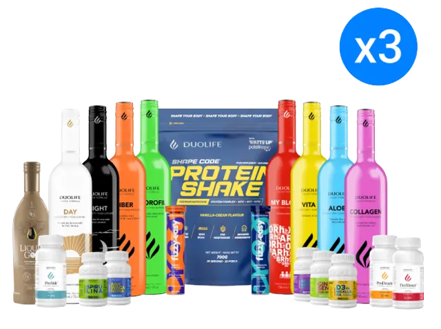 RANO: DUOLIFE Collagen – 25 ml przed posiłkiem. DUOLIFE Fiber – 25 ml podczas posiłku. DUOLIFE Dzień – 25 ml podczas posiłku. DUOLIFE My Blood – 25 ml w trakcie lub po posiłku. ProDeacid® – 2 kapsułki. DUOLIFE Żeń-szeń – 2 kapsułki. |