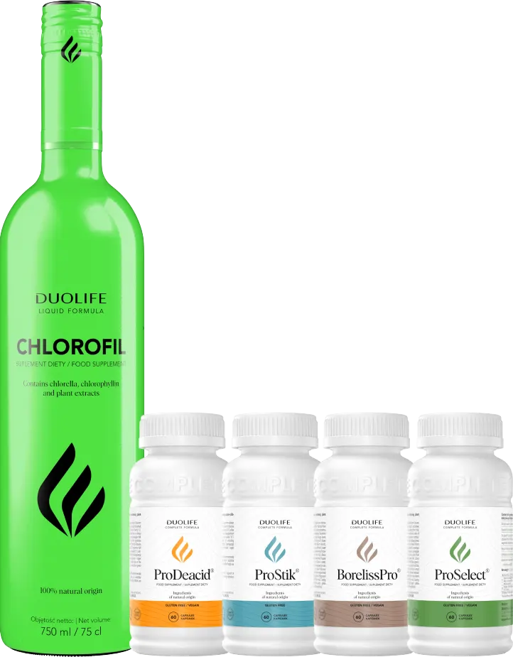 RANO: DUOLIFE Chlorofil - 20 ml dziennie. Porcję suplementu możesz rozpuścić w butelce (500 ml) wody i tak przygotowany płyn spożyć w ciągu dnia. ProDeacid® - 2 kapsułki po posiłku. |