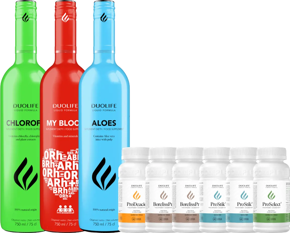 RANO: DUOLIFE Chlorofil - 20 ml dziennie. Porcję suplementu możesz rozpuścić w butelce (500 ml) wody i tak przygotowany płyn spożyć w ciągu dnia. DUOLIFE My Blood - 25 ml w trakcie lub po posiłku. ProDeacid® - 2 kapsułki po posiłku |